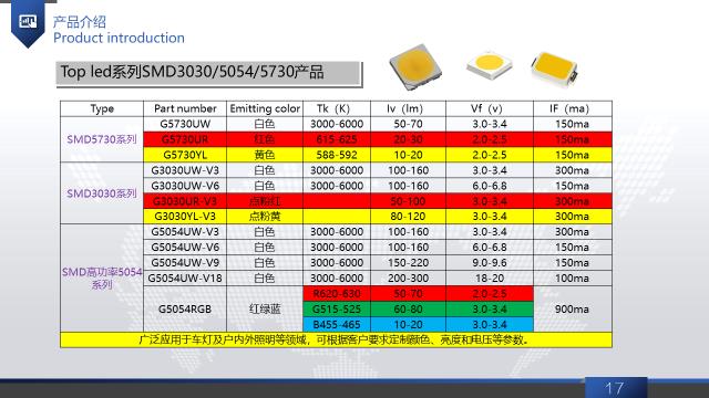 SMD3030/5054/5730LED为贴片大功率平面灯珠,功率1-3w,具有设计灵活、回流焊性能优异、高光效和性价比高等优点,广泛应用于大功率照明灯具如路灯、工厂灯和车灯等领域。